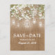 cartões postais de salvar a data com uma textura de aniagem marrom rústica, luzes de corda de jarra de mason elegantes, flores baby breath e texto branco.