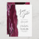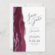 A borda esquerda deste elegante casamento moderno salve o cartão de data apresenta uma borda vermelha e borrifada de cor-d-água, aparada com falso brilho prateado. O texto personalizável combina o script de cinza de carvão e as fontes sans serif em um fundo branco. O lado inverso apresenta um design de burgundy e agate prateado.