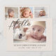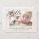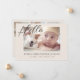 Script Baby Photo Modern Birn Announement . Cartão de aviso de nascimento com várias fotos, com lugar para uma foto de bebê na frente e três fotos menores na parte de trás. Design minimamente moderno com o guião Olá na frente do anúncio de nascimento.