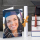 Esta placa de lançamento dobrada de formatura apresenta um sofisticado script branco manuscrito sobre uma foto de cheio chic do seu formando. Personalize esta placa de formando com um segundo grau de segundo, uma faculdade ou uma fotografia universitária no dentro, juntamente com os detalhes do seu mais velho. A imagem de trás está sobreposta com na moda branco puro para um olhar moderno para o seu cartão.