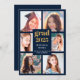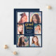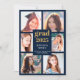 Envie a sua família e amigos um cartão moderno personalizado de graduação de colagem de fotos para os exultar. Este modelo moderno apresenta seis fotos para você mudar para o seu próprio quadro em azul. No centro em ouro e tipografia branca está a palavra "Formando" com o ano, seu nome e escola para personalizar. A parte de trás do cartão é azul. Desenhada por Susan Coffey.