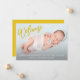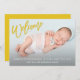 Este moderno anúncio de nascimento de bebês apresenta uma doce "bem-vinda" na tipografia da escrita de pincel amarelo e inclui uma fotografia do recém-nascido com as estatísticas do bebê na frente do cartão. A parte de trás do cartão é amarelo sólido, e perfeito para um menino ou menina.
