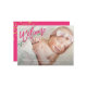 Este moderno anúncio de nascimento de bebês apresenta uma doce "bem-vinda" na tipografia de escrita rosa e inclui uma fotografia do recém-nascido com as estatísticas do bebê na frente do cartão. A parte de trás da carta é cor-de-rosa com a trendy faux gold confetti. Perfeito para uma menina.