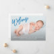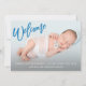 Este moderno anúncio de nascimento de bebês apresenta uma doce "bem-vinda" na tipografia da escrita de pincel azul e inclui uma fotografia do recém-nascido com as estatísticas do bebê na frente do cartão. A parte de trás da carta é branca sólida, perfeita para um menino.