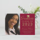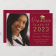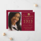 Anuncie seu Formandos à sua família e amigos com este cartão chic de anúncio. O elegante modelo de design apresenta sua fotografia à esquerda 3,5x5 e à direita sobre um fundo vermelho ela diz "CLASSE DE Formando DE 2023" com seu nome, grau, escola e data abaixo em uma tipografia moderna de falso roteiro dourado, acentuada por um boné de formatura de ouro. Desenhado pela artista ©Susan Coffey.