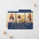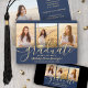 Compartilhe a alegria de uma formatura do ensino médio ou faculdade com esses convites personalizados de colagem de 4 fotos em azul marinho e dourado. Todas as imagens e textos são fáceis de personalizar. (DICA DE COLOCAÇÃO DE IMAGEM: Uma maneira fácil de centralizar uma foto exatamente como você quer é cortá-la antes de fazer o upload para o site da Zazzle.) Este modelo pode ser personalizado com quaisquer detalhes de sua escolha, como informações de convite para festa, nomes dos pais, honrarias especiais, título do diploma, citação inspiradora favorita, informações de contato do graduado, planos de educação futura ou novo cargo. O design apresenta um fundo azul escuro, boné de formatura em foil falso, caligrafia em estilo manuscrito, tipografia minimalista moderna e quatro fotos de sua escolha, como fotos de formatura ou imagens da cerimônia de formatura. Por favor, note que o dourado é uma cor impressa, não foil metálico. Esses cartões de anúncio de formatura são uma maneira moderna e elegante de compartilhar a celebração do seu