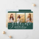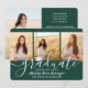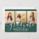 Compartilhe a alegria de uma formatura do ensino médio ou faculdade com esses anúncios personalizados de colagem de 4 fotos verdes e brancas. Todas as imagens e textos são fáceis de personalizar. (DICA DE COLOCAÇÃO DE IMAGEM: Uma maneira fácil de centralizar uma foto exatamente como você quer é cortá-la antes de fazer o upload para o site da Zazzle.) Este modelo pode ser personalizado com quaisquer detalhes de sua escolha, como informações de convite para festa, nomes dos pais, honrarias especiais, título do diploma, citação inspiradora favorita, informações de contato do graduado, planos de educação futura ou nova posição de trabalho. O design apresenta um fundo verde escuro, um boné de formatura branco, caligrafia de estilo manuscrito, tipografia minimalista moderna e quatro fotos de sua escolha, como fotos de formatura ou imagens da cerimônia de formatura. Esses cartões de anúncio de formatura elegantes são uma maneira moderna e sofisticada de compartilhar a celebração do seu dia especial com