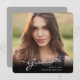 Um único cartão de anúncio de graduação quadrada personalizado, com elementos design do texto moderno fundidos com um roteiro elegante de caligrafia. A foto dos formandos destaca a frente do cartão, enquanto a parte traseira do cartão oferece espaços de texto personalizados para informações sobre a formatura e a viagem futura. Os fundos são gradiente escuro moderno na frente e cinzas prateadas na parte traseira ou personalizam facilmente a parte traseira da placa para uma cor de sua preferência. Para ver mais itens como este, visite minha loja aqui em "www.Zazzle.com/LakeViewCardCo". Obrigados