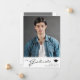 Cartão de anúncio de graduação surpreendente, com elementos design do texto moderno fundidos com um roteiro elegante de caligrafia. A foto dos formandos destaca a frente do cartão, enquanto a parte traseira do cartão oferece espaços de texto personalizados para informações sobre a formatura e a viagem futura. Os fundos são brancos, com um gradiente fino na frente e tons regais de cinza e brancos no verso. Para ver mais itens como este, visite minha loja aqui em "www.Zazzle.com/LakeViewCardCo". Obrigados