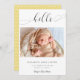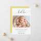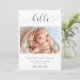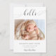 "Alô" em letra elegante de escrita com baloiços de rico. Um anúncio simples e elegante de nascimento de um bebê fotográfico. Um olhar moderno, minimalista e limpo. O verso tem um padrão de bolinhas fofo.