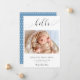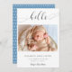 "Alô" em letra elegante de escrita com baloiços de rico. Um anúncio simples e elegante de nascimento de um bebê fotográfico. Um olhar moderno, minimalista e limpo. O verso tem um padrão de bolinhas fofo.
