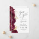 Este elegante casamento moderno salve o cartão de data mostra uma borda de flores burgundy e folhas de folhas falsas de ouro. O texto personalizável combina o script de cinza de carvão e as fontes sans serif. O verso repete o design de borda floral.
