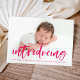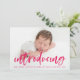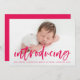 Cartão de anúncio de nascimento de foto moderno que apresenta a foto horizontal do recém-nascido do seu bebê com "apresentação" apresentada numa cobertura de escrita de pincel magenta. Personalize a frente dos simples anúncios de nascimento com o nome do bebê e as estatísticas de nascimento. A placa reverte para exibir um fundo magenta sólido com espaço para fotos e texto adicionais.