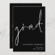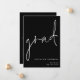 Moderno Script 2025 Graduação Preta. Este simples design monocromático para anunciar a notícia do seu formando tem um script informal do estilo de escrita manual do conjunto para o cabeçalho principal, formando e fácil personalização da tipografia no canto inferior direito com os seus detalhes e também a sua mensagem no verso.