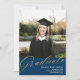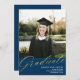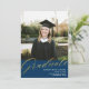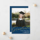 Este anúncio de graduação de fotos apresenta uma saudação moderna de caligrafia "formando" em folha de ouro falso com fundo azul marinho. O backer é da mesma cor azul do marinho. Este simples e divertido design realmente permite que sua foto brilhe mantendo os detalhes mínimos enquanto a saudação define o tom festivo. Dica: você pode facilmente adicionar mais texto ou uma foto adicional no verso.