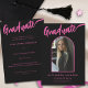 Celebre o segundo grau da Filha, a graduação universitária ou universitária com um Belo formando preto e rosa-quente - arco de fotos elegante com roteiro de lançamento. Marque a formatura de sua filha com este Cartão de Anúncio de Graduação de Caligrafia Moderno, rosa-quente, com Script Quente, projetado para capturar o espírito da ocasião. Apresentando um elegante roteiro de caligrafia rosa sobre um fundo preto em greve e um elegante arco rosa-quente, este cartão exude estilo e encanto. A frente exibe a palavra formando em elegante caligrafia rosa-quente com script que complementa o nome da sua filha e os detalhes de graduação em tipografia contemporânea rosa-quente em um fundo preto impressionante, enquanto a parte de trás destaca informações adicionais na tipografia rosa-quente moderna. Este cartão inclui um modelo de fotografia fácil de usar, que permite personalizá-lo com uma foto apreciada do seu formando, fazer-o exclusivamente dela. Arte e design únicas originais criadas pela artista Catherine Sweetman, esta carta é uma maneira impressionante de comemorar a sua conquista universitária e partilhar a alegre ocasião com amigos e familiares.