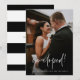 Nós fugimos! Anuncie o seu casamento à família e amigos com esta simples e moderna carta de fotos. Ele apresenta uma cobertura de script manuscrito branco com faixas pretas e brancas. Personalize adicionando nomes, data, local e uma foto.