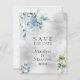 Um casamento moderno e elegante pintado com aquarela Salve o convite da data apresentando um buquê de florescências de peônia azul empoeiradas penduradas em um galho contra uma lavagem com aquarela prateada com um serifa vivo e fino.