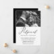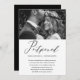 Elegante muda a data do anúncio de adiamento do casamento. Este simples anúncio é uma maneira engraçada de deixar os convidados saberem que sua data de casamento foi remarcada devido a circunstâncias imprevistas, e inclui a nova data de casamento. Este anúncio de tendência apresenta um belo roteiro de caligrafia preto "adiado" em um fundo branco com a foto do casal, e uma parte de trás preta do cartão.