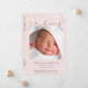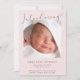 Um simples anúncio de nascimento de uma menina rosa pastel com escrita de cinza mole e tipografia. A frente apresenta a foto do seu recém-nascido, o nome do cheio, a data de chegada e as estatísticas de natalidade, os membros da família e a "Introdução" escrita em um roteiro de na moda final com um coração florescente. No verso do cartão, você pode adicionar três fotos adicionais e um obrigado, visitação ou outro texto.