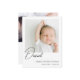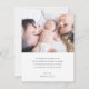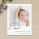 Na frente, este simples e na moda, modelo de anúncio de nascimento de fotos, simples e moderno, mostra o nome do seu bebê com detalhes abaixo da sua foto, juntamente com o nome do seu bebê, em um roteiro caloroso e expressivo que se sobrepõe parcialmente à foto. A cor padrão do texto em ambos os lados é preto. Também incluímos espaço para uma foto no verso. Você pode optar por alterar a fonte, a pontuação ou a cor usada para vários elementos de texto deste design na frente e/ou no verso. Por exemplo, você pode mudar o nome ou outro texto para azul, rosa, ouro ou uma cor diferente. O plano de fundo padrão em ambos os lados é definido como transparente para permitir que a cor do papel sirva simplesmente como tom base. Mas você pode facilmente mudar isso selecionando uma das cores básicas nas ferramentas de edição, inserindo outro número de cor no lugar da nossa, se você tiver uma matiz específica em sua pesquisa, ou olhando para a ferramenta do espectro de cores e escolhendo algo à vista. Colocamos algum texto de marcador de posição no verso para que você exclua e substitua por sua própria mensagem, com ou sem seus nomes, se você quiser assinar manualmente quando receber os cartões. Mas você pode simplesmente optar por excluir nosso texto de marcador de posição e deixar o vazio de trás completamente para que você possa escrever uma mensagem manualmente em cada cartão e assinar seus nomes. O tipo de papel padrão, matte, tem um calor suave e resiste a manobras, então é uma escolha excelente para escrevendo sua própria mensagem. Em vez disso, você pode editar isso e escolher semirdano ou outro tipo de papel. Em qualquer caso, lembre-se de que há uma segunda foto, assim como um texto de marcador de posição, também no verso, e apague todo o texto de amostra/marcador de posição em ambos os lados do cartão e substitua ambas as fotos de amostra pela sua. Use as ferramentas intuitivas de design, suas fotos favoritas e sua inspiração para fazer com que este cartão moderno de nascimento chic seja exclusivamente seu. Temos uma seleção de outros anúncios de chegada de bebês, na moda, por isso, por favor, procurem mais ideias na nossa loja!