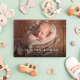 Apresente o seu novo bebê com este doce e simples anúncio clássico de nascimento de fotos. As boas-vindas são uma escritura elegante e moderna e há espaço para um nome grande, estatísticas e nomes de pais também. O dorso é um moderno azul macio pontilhado com branco. Perfeito para compartilhar fotos de recém-nascidos com amigos e familiares!