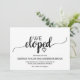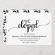 Estes simples cartões de anúncio de elopemento de caligrafia negra têm um belo design moderno tema rústico. A design minimalista apresenta uma elegante letra de escrita de pincel e um adorável coração feminino, e lê "nós fugimos!". O suporte apresenta um padrão clássico de folhas e ramos.