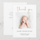 Esta carta simples, personalizada e encantadora, de anúncio de nascimento de um bebê apresenta um design contemporâneo que permite personalizá-lo facilmente de acordo com o seu estilo. Escolhemos cantos nítidos padrão como a configuração padrão de forma, mas você pode facilmente mudar a aparência para cantos arredondados, pois essa aparência também funciona maravilhosamente com esta design. Tente os dois no modo de edição e veja qual é a sua capacidade! Nós demos a esta design minimalista um salto de pânico com 'obrigado você' acima da foto em uma fonte moderna relaxada que dá um sentimento de calor e familiaridade. Para destacar este aspecto do design, escolhemos um tom de ouro elegante para o roteiro 'obrigado você'. Este script é uma imagem e não pode ser alterado, mas você pode alterar a cor, a fonte e o tamanho de qualquer outro texto em ambos os lados de acordo com o seu gosto. A cor padrão do nome e dos detalhes na frente é um preto ligeiramente suavizado, e a cor padrão do texto marcador de posição na parte traseira é um tom de cinza escuro que é majoritariamente preto. Se preferir uma aparência mais minimalista, você pode excluir sem substituir nenhuma de nossas estatísticas de amostra na frente - talvez não queira incluir a hora do dia ou a duração, por exemplo. Nós definimos o plano de fundo de ambos os lados como transparente, para que a cor do seu papel sirva simplesmente como o tom base. Você pode mudar isso em um ou em ambos os lados escolhendo uma cor. Na parte traseira, adicionamos um texto de espaço reservado para que você substitua por sua própria mensagem. Você pode alterar a fonte e a cor do texto. Depois de excluir nosso texto de marcador de posição, você pode simplesmente deixar o vazio de trás completamente, para que possa adicionar uma mensagem manuscrita com suas assinaturas depois de receber seus cartões. Em qualquer caso, lembre-se de remover todo o texto do marcador de posição, assim como nossa foto de amostra! O tipo de papel padrão, matte, tem um calor suave e resiste a manobras, então é uma escolha excelente para escrevendo sua própria mensagem. Use as ferramentas intuitivas de design, sua foto favorita e sua inspiração para personalizar este obrigado personalizado, seu cartão plano de lançamento e torná-lo exclusivamente seu!