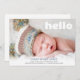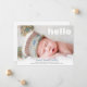 Anuncie o nascimento do seu filho com este moderno cartão de anúncio personalizado do bebê fotográfico. Este simples modelo de design apresenta uma imagem na frente do cartão com a palavra "olá" em tipografia branca. Abaixo estão os detalhes do nome e nascimento do seu bebê em texto azul e cinza. A parte traseira da placa é branca. Parabéns pelo seu novo pacote de alegria! Desenhado pela artista ©Susan Coffey.