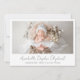 Cartão de anúncio de nascimento moderno com uma foto horizontal da sua nova menina e seu nome em um roteiro elegante. O verso tem uma segunda imagem junto com "obrigado você" e sua mensagem pessoal. Estes cartões de anúncio são um excelente para compartilhar a notícia da sua bebê recém-nascida.