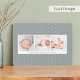 O simples anúncio de nascimento moderno apresenta uma foto horizontal ou orientada para a paisagem, com cheio de solteiro com faixa pontiaguda no canto superior direito, com o nome do bebê, data de nascimento e estatísticas de natalidade. Adicione uma mensagem pessoal ao verso, juntamente com três fotos quadradas adicionais.
