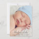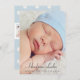 Anuncie seu novo filho à família e amigos em estilo com este anúncio de nascimento de fotos simplesmente adorável. Possui uma cinza de carvão elegante (pode ser personalizada) sobreposição de texto na foto em destaque e três fotos quadradas na parte traseira da placa com texto que pode ser personalizado. O fundo no verso inclui um padrão de bolinhas azul e branco para bebês com uma aparência texturizada. Use o recurso "personalizar" para editar as cores e a posição do texto.