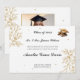 Este é um anúncio elegante de graduação com um design floral de ouro com sotaques delicados e uma fonte sofisticada de escrita. O layout inclui texto personalizável para o nome do formando e uma foto no verso. Uma pequena ilustração de boné de formatura acrescenta um toque comemorativo. Perfeito para comemorações formais e de na moda.