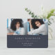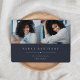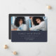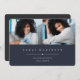 O anúncio simples e moderno de fotos de graduação apresenta duas fotos alinhadas lado a lado, com o nome do formando, a escola e o ano de aula em letras brancas, em um fundo azul marinho da meia-noite. Seu nome de formando e escola aparecem embaixo. Adicione uma mensagem pessoal ao verso, juntamente com uma foto adicional.