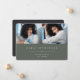 O anúncio de fotos da formatura simples e moderna apresenta duas fotos alinhadas lado a lado, com o nome do formando, a escola e o ano de aula em letras brancas em um fundo verde-sábio escuro. Seu nome de formando e escola aparecem embaixo. Adicione uma mensagem pessoal ao verso, juntamente com uma foto adicional.