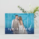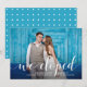 Esta divertida carta de anúncio de casamento, "nós fugimos", mostra sua própria foto de casamento, mais tipografia branca e branca. Adicione seus nomes, data do casamento e local à frente. A parte traseira apresenta uma cor vibrante e lacrimejante com bolinhas brancas.
