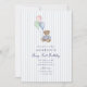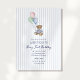 Adorable teddy bear first birthday invitation featuring a sweet watercolor bear holding pastel balloons against soft blue vertical stripes. This “Beary First Birthday” invitation is perfect for a baby boy’s first birthday party with a gentle, storybook feel. The classic blue palette and charming teddy bear illustration make it ideal for teddy bear themes, vintage baby celebrations, and soft nursery-inspired birthday parties. A lovely choice for parents planning a sweet and timeless blue first birthday celebration.