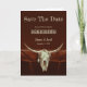 O cowboy rustico ocidental divertiu-se com madeira marrom, salvando os cartões dobrados. Convites de crânio de vaca. Um design bonito, engraçado, estilo fazenda. O texto pode ser personalizado. Vintagem antiga de antiguidade selvagem ocidental única. animal legal, de moda fazenda. Personalizar script e tipografia. Imagem copyright Marg Seregelyi Fotografia.