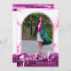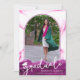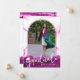 Crie um impressionante anúncio de fotos da graduação apresentando cores tennais magenta e rosa e brilho fino rosa para sua filha com tipografia de script manuscrito chic para o FORMANDO do título acentuado com um boné de formatura ou placa-mãe em branco e uma foto em um arco moderno na frente. O verso apresenta uma fotografia e o seu texto personalizado para incluir detalhes sobre o seu formando. Faz uma design única que reflete seu estilo e/ou coordenadas com suas fotos para compartilhar com seus amigos e família. ASSISTÊNCIA: para obter ajuda com a modificação ou personalização do design, alteração de cor, redimensionamento ou transferência do design para outro produto, entre em contato com o designer ANTES DE ENCOMENDAR através da guia MENSAGEM de Bate-papo Zazzle abaixo ou envie um email para makeitaboutyoustore@gmail.com.