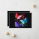 Três borboletas luminosas, vermelhas, roxas, verdes, texturizadas, noturnas sobre fundo luminoso preto.