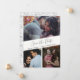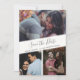 Salve a data de três cartões com fotos para o seu próximo casamento em um design moderno na moda. Estes cartões são personalizados com três das suas fotos, seus nomes e detalhes do casamento. A placa se reverte para uma simples cinza e design floral branco no verso.