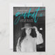 Cartão de anúncio de graduação moderno com a foto favorita do seu formando na frente com "Formando" em um roteiro manuscrito turquesa. Personalize a frente do anúncio adicionando o nome do formando, o nome da escola e o ano de graduação. O anúncio da graduação da tendência reverte para exibir 3 fotos adicionais com espaço para texto, como planos futuros, detalhes da graduação, detalhes do partido, etc. O anúncio de 4 fotos é perfeito para formandos de segundo grau e de faculdade.