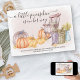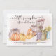 Um pouco de abóbora está a caminho, caia no cartão de anúncio de gravidez - fácil de personalizar com a sua mensagem e data de vencimento do bebê. A design rustic watercolor tem uma cena de varanda do país com uma cadeira de balanço, cesto de toros, jarro de trigo e colheita de abóboras-do-campo. Ele tem um fundo de lavagem esbranquiçado com uma cadeira de balanço cor-de-rosa e uma pequena abóbora está a caminho é escrita com elegante guião manuscrito.