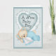 Um grande coração com rendas ao redor dizendo "Um novo menino", com um urso bonito em azul e adormecendo um cobertor no fundo. Um design caprichoso por anunciar o nascimento de um novo bebê - ou para felicitar um casal ao seu novo bebê. Obtenha os selos de correio também!