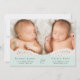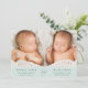 Mínimo anúncio de nascimento de colagem de fotos do garoto verde-menta ou gêmeos-menina. A frente mostra suas fotos, nomes, datas de chegada e estatísticas de natalidade em uma tipografia simples e moderna. No verso, adicione três fotos adicionais e sua mensagem "bem-vinda".