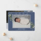 Uma maneira elegante de apresentar seu novo bebê. Com vegetação desbotada e ramificações de eucalipto sobre um fundo azul moderno. Personalize com 3 das suas fotos favoritas de bebês, nome de bebê, estatísticas e uma mensagem extra nas costas para a sua família e amigos.