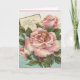 Uma ilustração do vintage de um cartão novo do bebê caracteriza grandes rosas cor-de-rosa com um bebê novo snuggled no centro macio de uma das flores. Um cartão de presente na parte dianteira do cartão diz, a "boa vinda ao bebê novo doce" e à mensagem dentro do cartão é: "Boa vinda ao mundo o pequeno! É um cheio do lugar dos prazeres e quer saber."