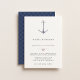 Beautiful watercolor anchor and heart shaped rope knot accent with navy blue nautical knot pattern backing, wedding invitation.