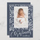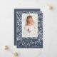 Folhas brancas e pontos em um sotaque de fundo azul denim a foto do seu bebê recém-nascido com seu Feliz Natal e seu nome familiar na frente e a informação de nascimento do seu bebê na parte de trás. Selecione alta definição para melhor qualidade de impressão. Mais designs na nossa coleção.