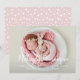 Os anúncios de nascimento elegantemente doces apresentam sua foto favorita de recém-nascido em hemorragia de cheio, com o nome de sua filhinha, estatísticas de natalidade e seus nomes em um roteiro de caligrafia branca centrado no fundo. No verso, altere a cor rosa de fundo para qualquer cor que se ajuste à sua foto sob as bolinhas brancas ou remova os pontos.